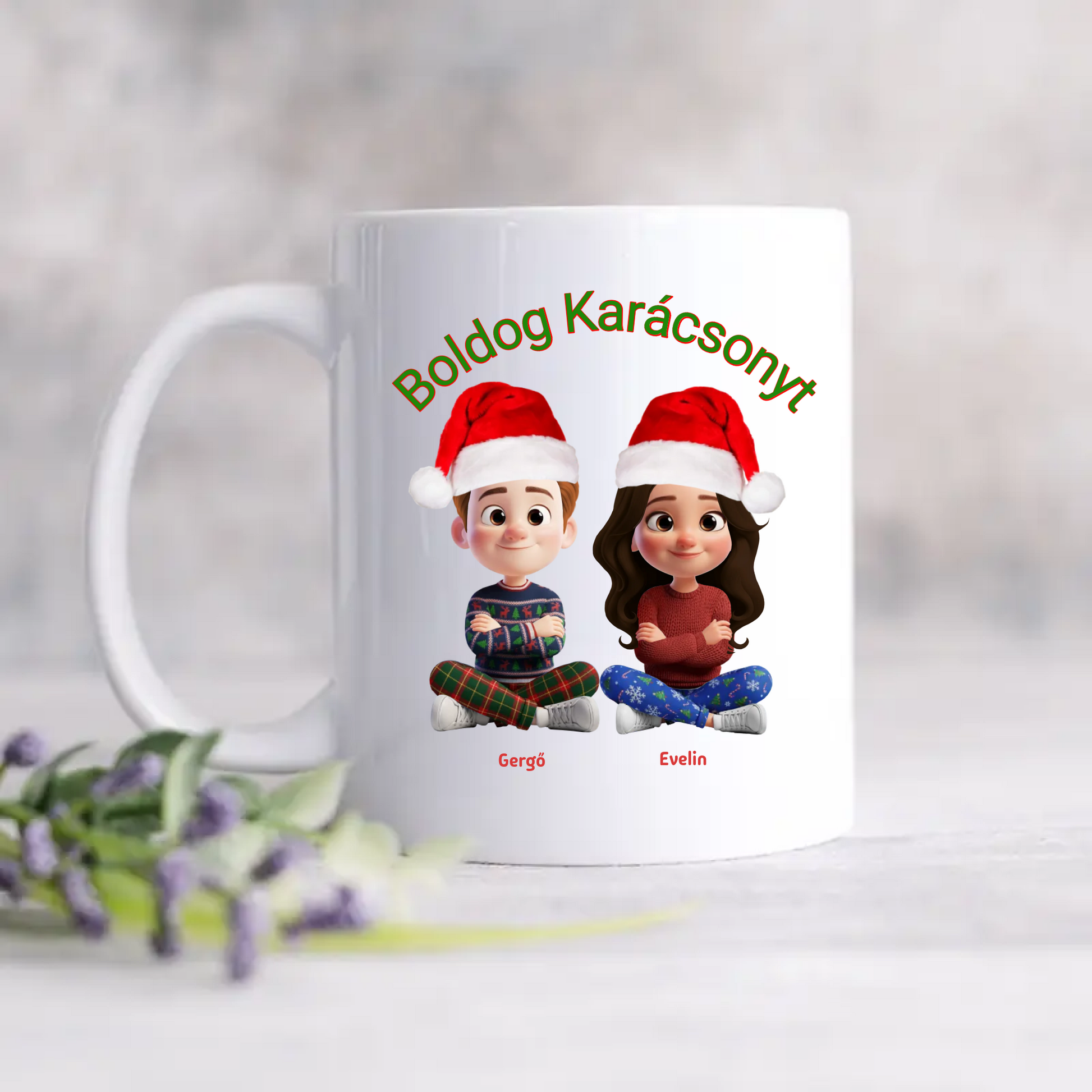 Tedd különlegessé az ünnepeket ezzel az egyedi, aranyos karakteres karácsonyi bögrével! A bögre teljesen személyre szabható: névvel, karakterrel, hajjal, ruhával és ünnepi kiegészítőkkel.